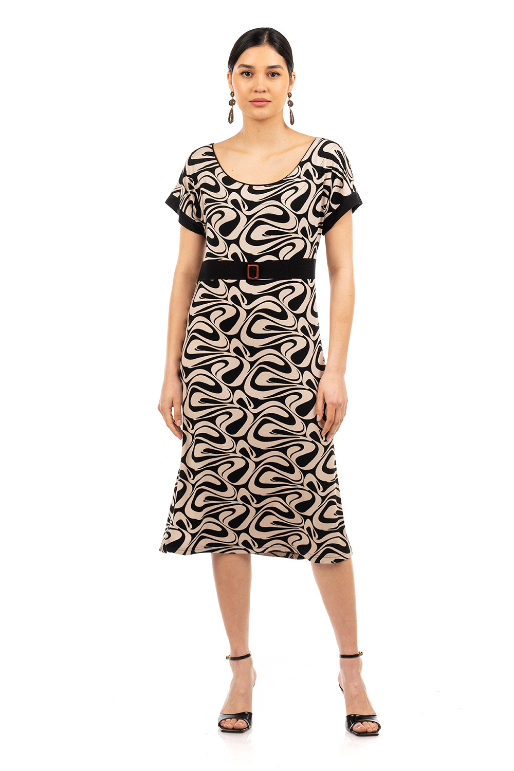 Αέρινο καλοκαιρινό φόρεμα με αφηρημένο μοτίβο. Είναι σχεδιασμένο για να σας χαρίσει κομψότητα με στρογγυλή λαιμόκοψη, κοντά μανίκια και διακοσμητική ζώνη στη μέση σε χαλαρή γραμμή που αγκαλίαζει το σώμα. Κατασκευασμένο από ελαστική βισκόζ είναι άνετο και ιδανικό για να απολαύσετε όλες τις ώρες της ημέρας.