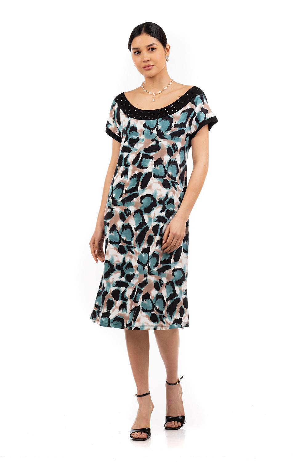 Ανανεώστε την διάθεση σας με αυτό το εντυπωσιακό καλοκαιρινό φόρεμα σε ζωηρό τροπικό μοτίβο. Φτιαγμένο από απαλό βισκόζ, χαρίζει αέρινη εφαρμογή και κομψότητα. Το ζωηρό μοτίβο, η χαλαρή γραμμή και η κολακευτική λαιμόκοψη με στρας-μέταλλα επάνω, το καθιστούν ιδανικό για την παραλία ή τις βόλτες σας στην πόλη.