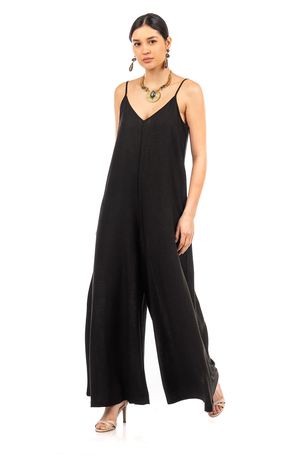 Ανανεώστε την συλλογή σας με αυτή την αέρινη ολόσωμη φόρμα. Σχεδιασμένη με λεπτές ρυθμιζόμενες τιράντες, V λαιμόκοψη και φαρδύ παντελόνι σε άνετη γραμμή θα σας χαρίσει όμορφες και γεμάτες άνεση βόλτες όλο το καλοκαίρι.
