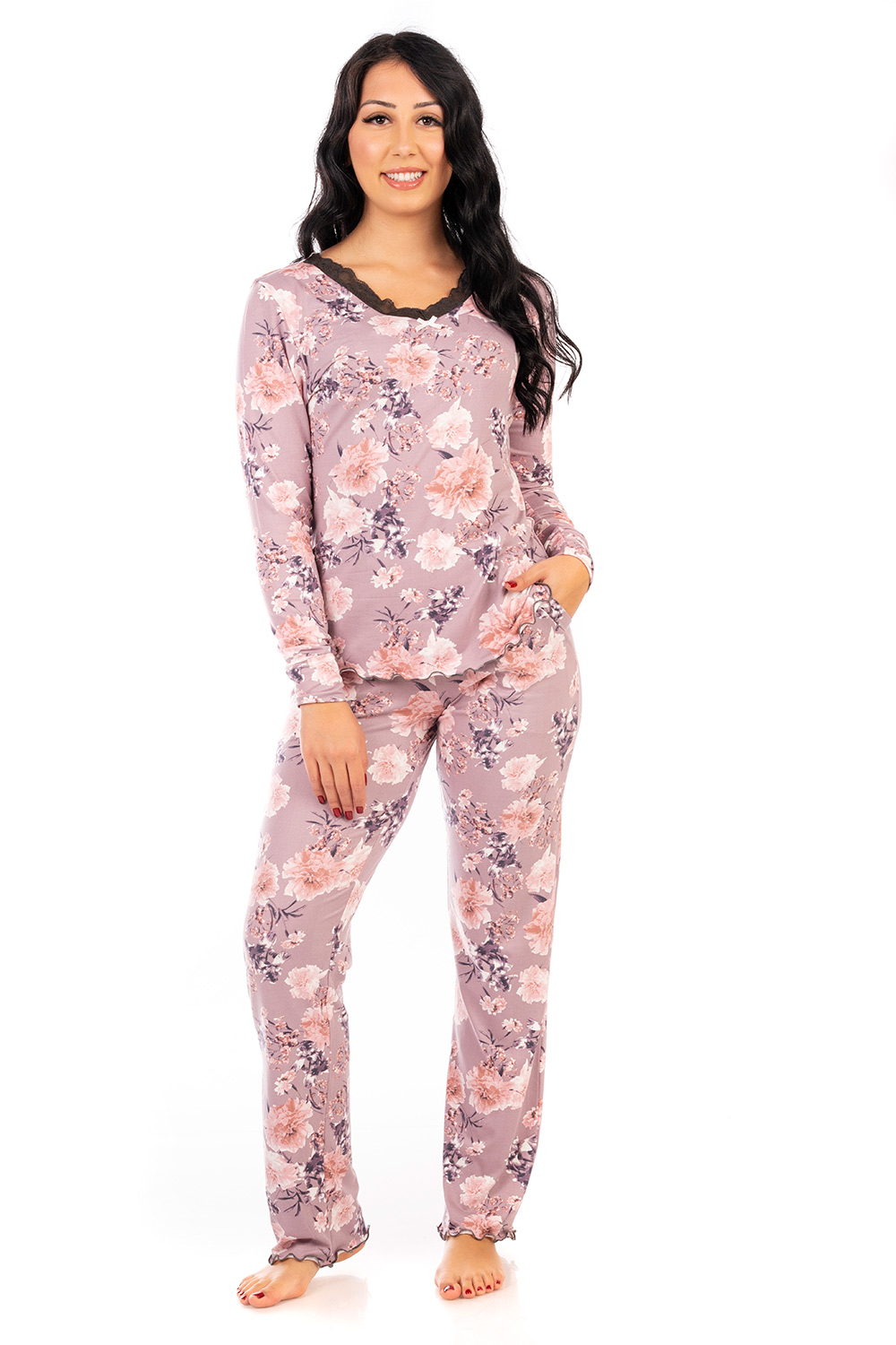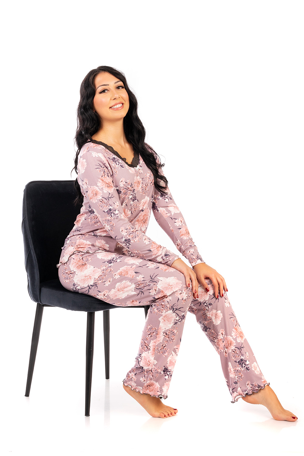Αφεθείτε στην άνεση και την απαλή υφή που προσφέρει αυτό το Σετ γυναικείες πιτζάμες από μαλακή ελαστική viscose. Η μπλούζα διαθέτει λαιμόκοψη με ελαστική δαντέλα, μακριά μανίκια με μανσέτα και βολάν στο τελείωμα της. Το Σετ συμπληρώνει το παντελόνι με βολάν στο κάτω μέρος για πιο άνετη εφαρμογή. Σχεδιασμένο σε φλοράλ μοτίβο σε ροζ παστέλ αποχρώσεις θα σας χαρίσει μια αίσθηση πολυτέλειας και άνεσης για στιγμές χαλάρωσης στο σπίτι. Ελληνικό προϊόν.