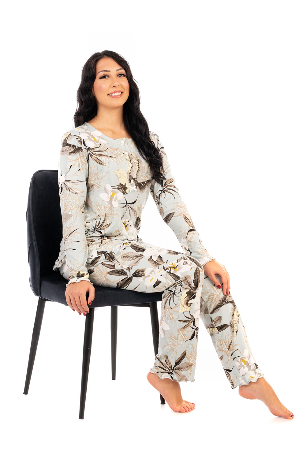 Γυναικεία πιτζάμα βισκόζη. Μπλούζα σε φλοράλ μοτίβο, διαθέτει πατιλέτα με διακοσμητικό φιογκάκι και διακριτικό βολανάκι στο τελείωμα. Παντελόνι σε άνετη γραμμή με βολάν στο τελείωμα σε φλοράλ βεραμάν μοτίβο. Ελληνικό προϊόν.