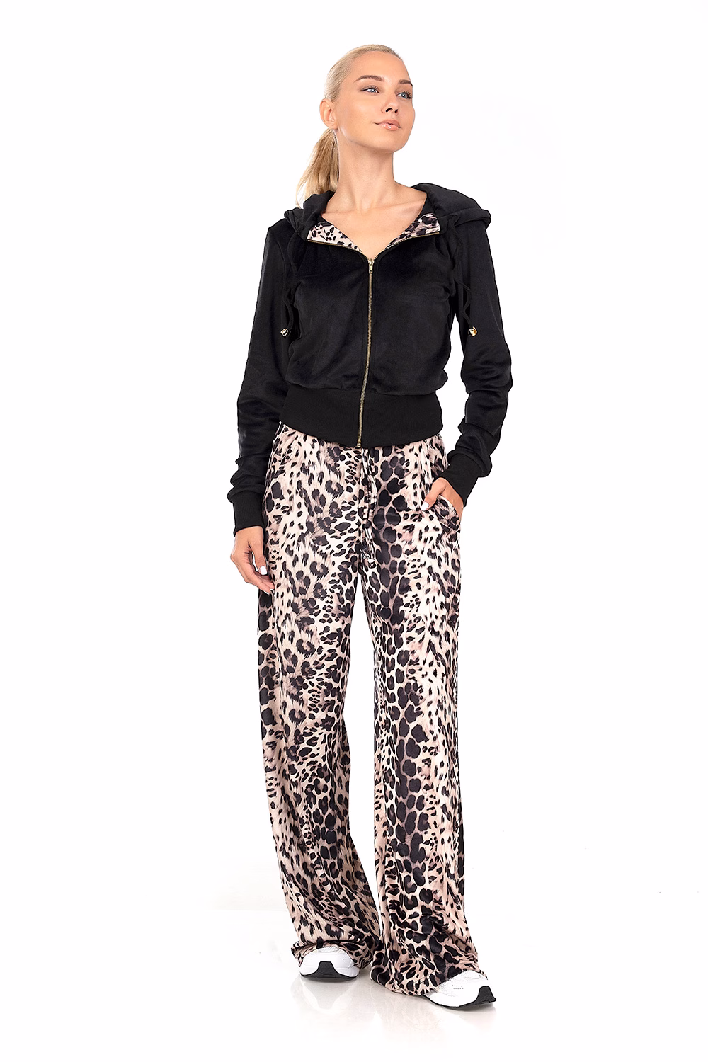 Ανανεώστε την γκαρνταρόμπα σας με αυτό το χειμερινό Σετ φόρμας, κατασκευασμένο από βελούδο. Το πάνω μέρος είναι σχεδιαμσένο με φερμουάρ, πλαϊνές τσέπες, διαθέτει κουκούλα, μακρία μανίκια με μασνέτες και λάστιχο στην μπάσκα για βέλτιστη εφαρμογή. Παντελόνι φαρδύ σε ίσια γραμμή με animal print μοτίβο. Ιδανική επιλογή για casual εξόδους. Ελληνικό προϊόν.