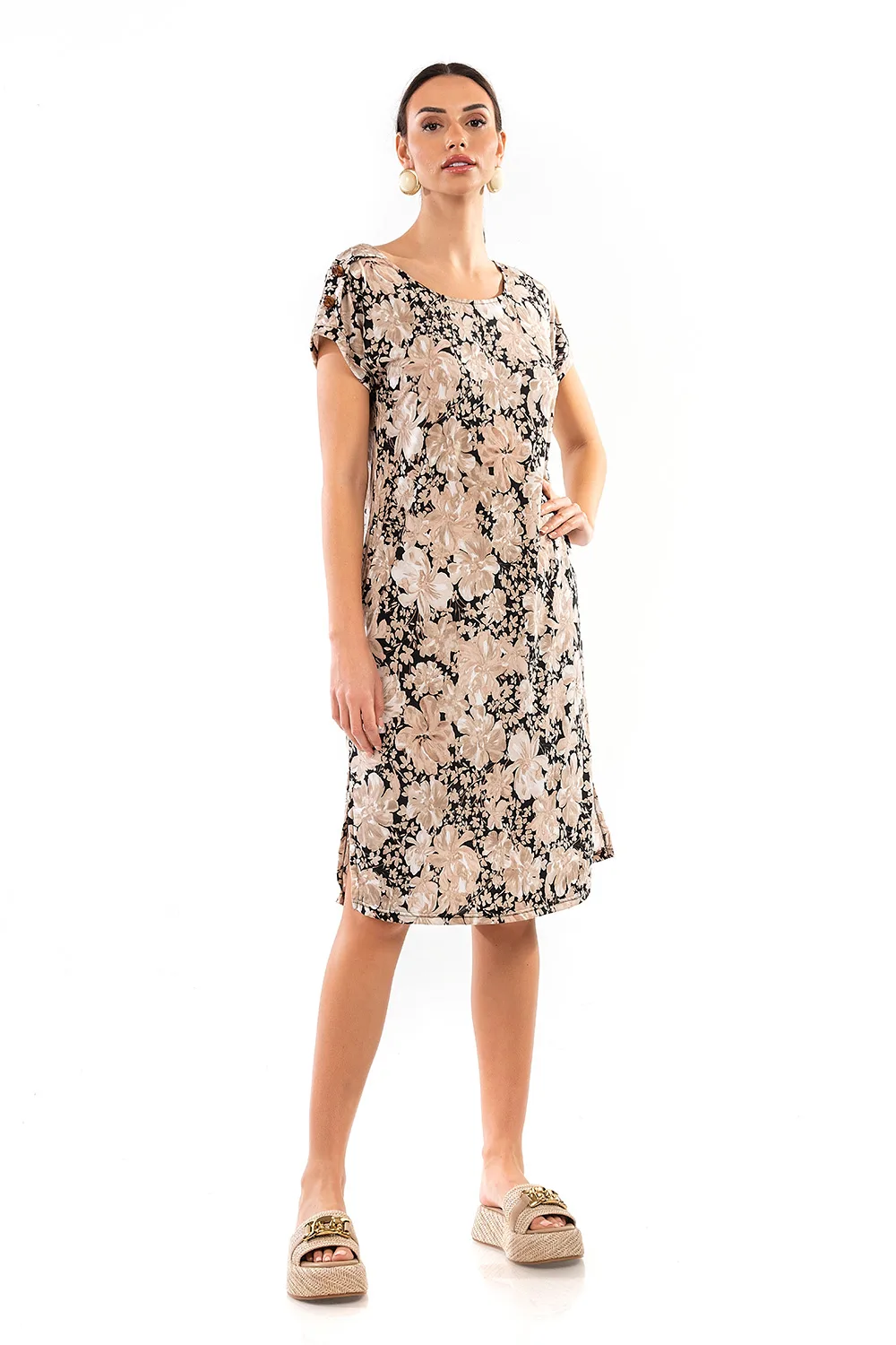 Ανανεώστε την γκαρτναρόμπα σας με ένα κομψό καλοκαιρινό εμπριμέ φόρεμα. Είναι φιαγμένο από απαλή ελαστική βισκόζ που προσφέρει δροσερή αίσθηση και τέλεια εφαρμογή. Με στρογγυλή λαιμόκοψη, κοντά μανίκια, τσέπες και διακοσμητικά κουμπιά στον ώμο, είναι ιδανικό για χαλαρές εμφανίσεις και βόλτες στην παραλία.
