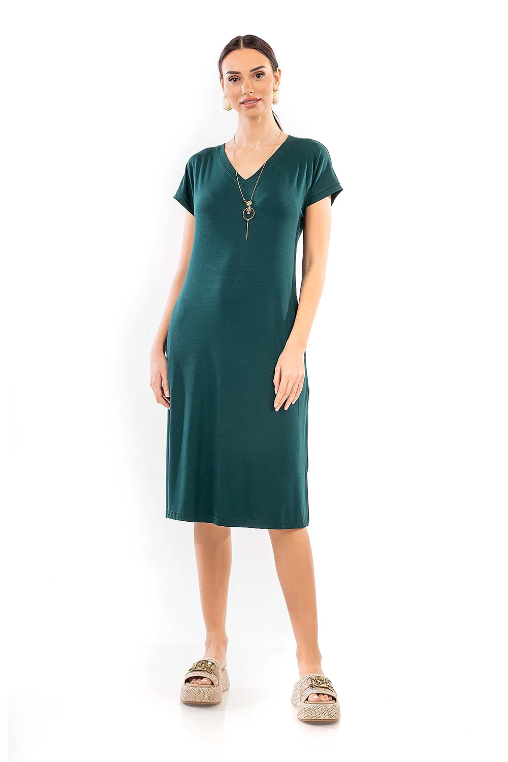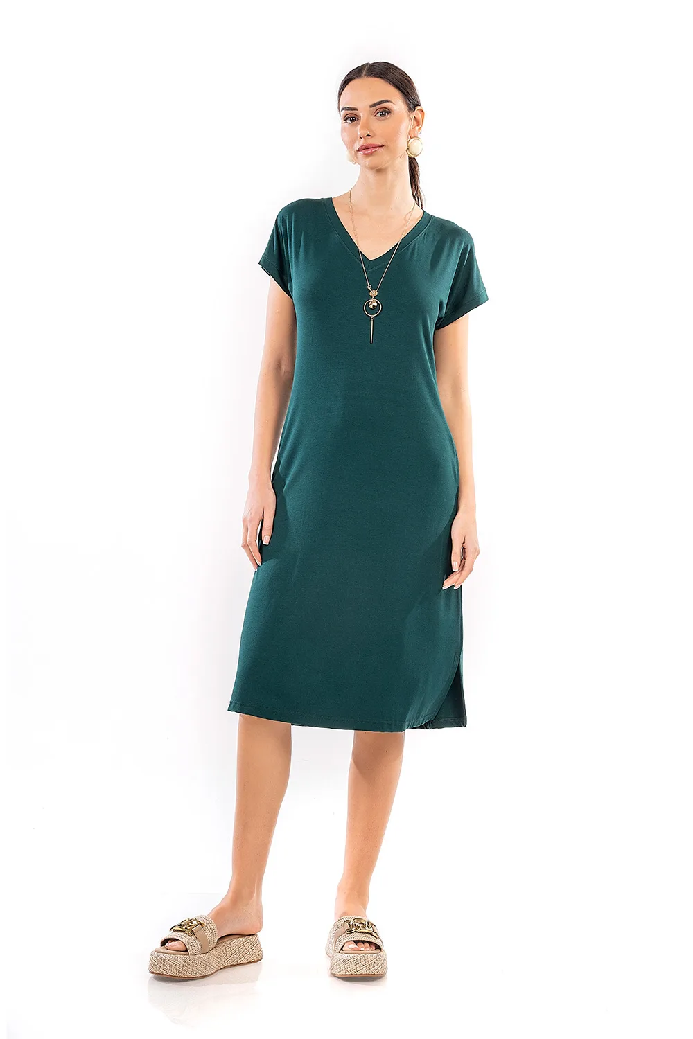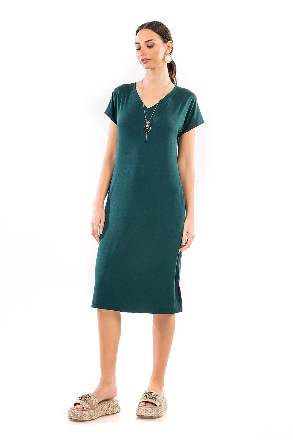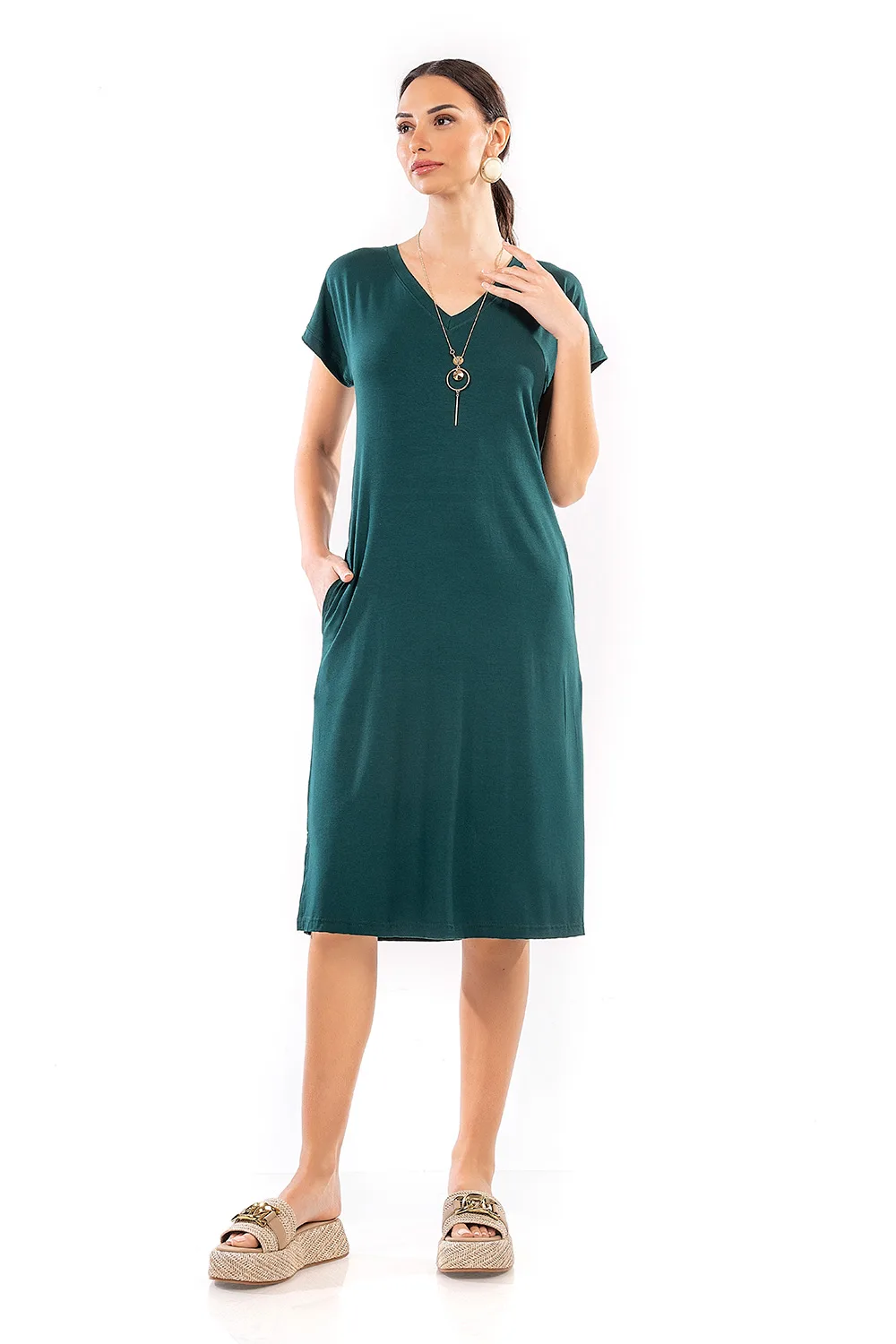 Απολαύστε κάθε στιγμή με ένα καλοκαιρινό φόρεμα από ελαφριά και δροσερή βισκόζ. Σχεδιασμένο με V λαιμόκοψη, αποσπώμενο κολιέ, κοντά μανίκια και τσέπες στο πλάι σε χαλαρή και άνετη γραμμή. Είναι μια ιδανική επιλογή για κομψές εμφανίσεις.