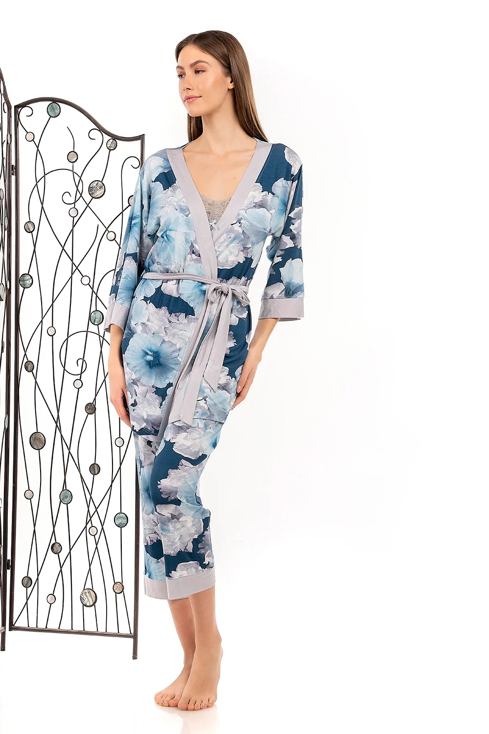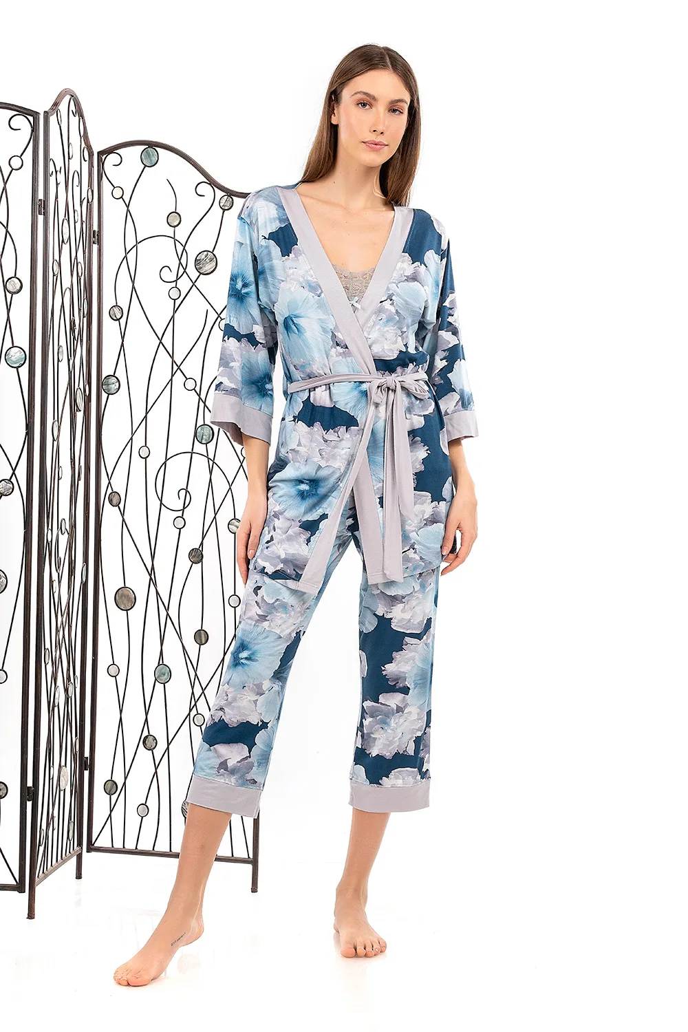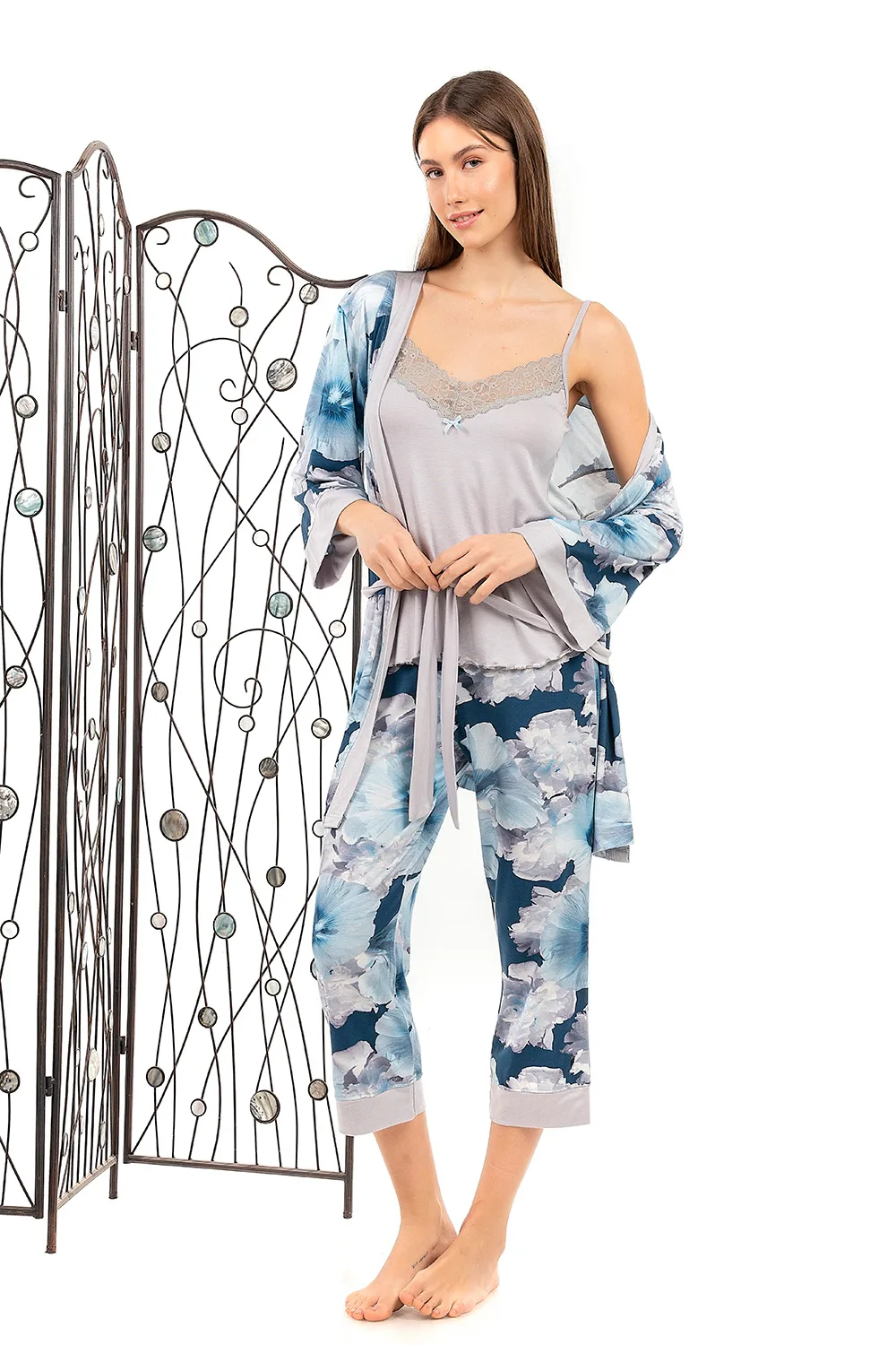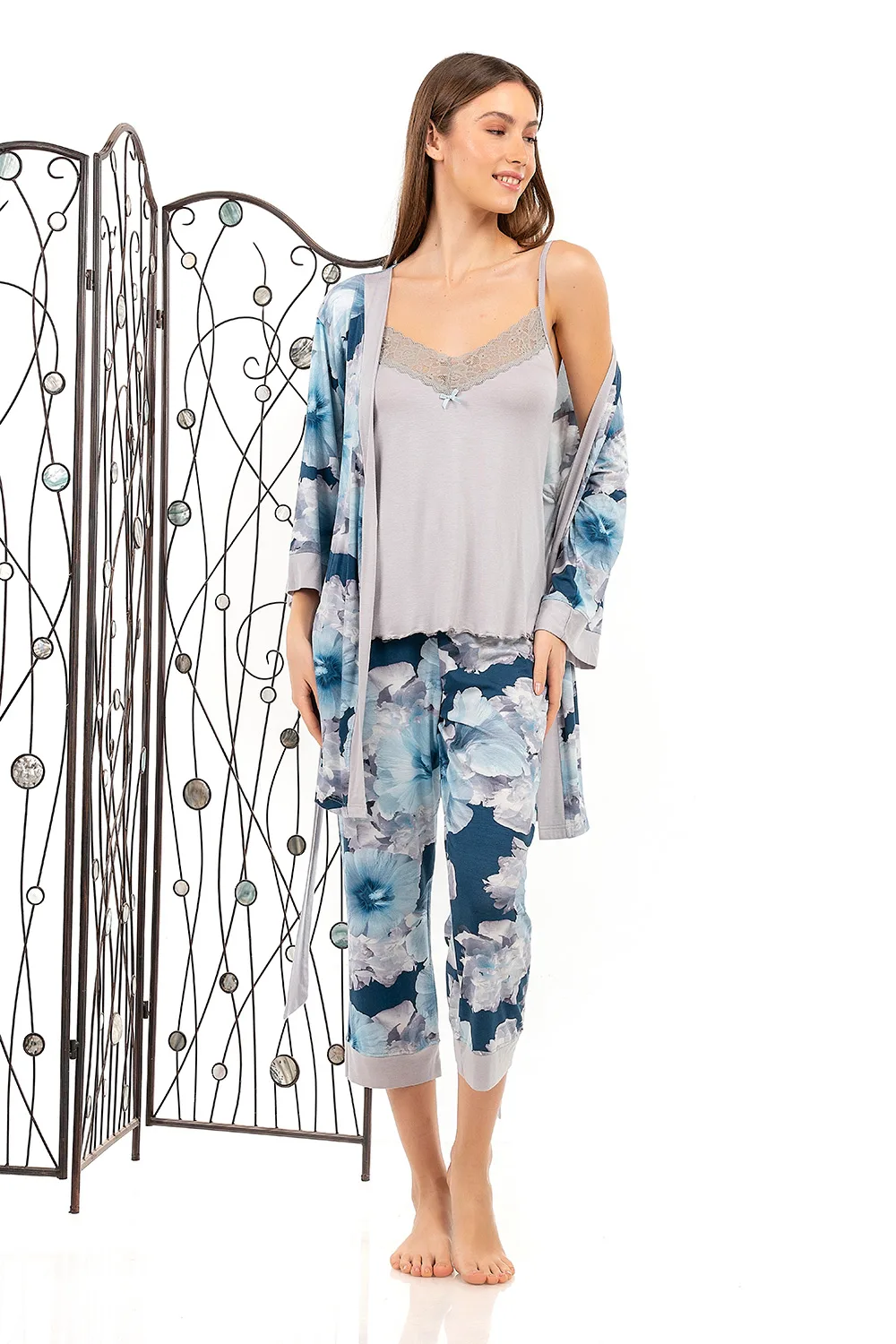 Μείνετε δροσερή και θηλυκή με αυτό το καλοκαιρινό Σετ 3 Τεμαχίων που περιλαμβάνει μονόχρωμο τοπάκι με ρυθμιζόμενες τιράντες για καλύτερη εφαρμογή, V λαιμόκοψη με διακριτική ελαστική δαντέλα, παντελόνι εμπριμέ κάπρι με μονόχρωμο ρεβέρ στο τελείωμα και εμπριμέ σταυρωτή ρόμπα με μανίκι ως τον αγκόνα και μονόχρωμες λεπτομέρειες. Σχεδιασμένο σε κανονική γραμμή απο 100% βισκόζ με μοτίβο φλοράλ στα χρώματα του ωκεανού. Θα σας εξασφαλίσει ήρεμες και χαλαρές καλοκαιρινές βραδιές.