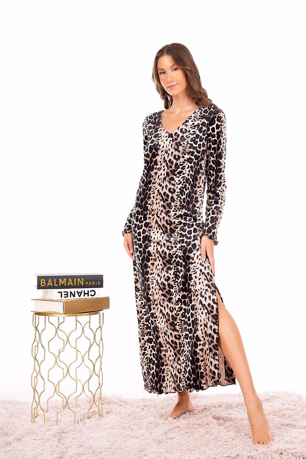 Επιλέξτε ένα κομψό χειμερινό καφτάνι κατασκευασμένο από απαλό ζεστό βελούδο σε εντυπωσιακό animal print μοτίβο που προσδίδει μια διαχρονική θηλυκή αίσθηση με μοντέρνο χαρακτήρα. Είναι σχεδιασμένο με V λαιμόκοψη σε άνετη γραμμή, ενώ τα ανοίγματα στο πλάι χαρίζουν ελευθερία κινήσεων. Ιδανικό για στιγμές χαλάρωσης στο σπίτι. Ελληνικό προϊόν.