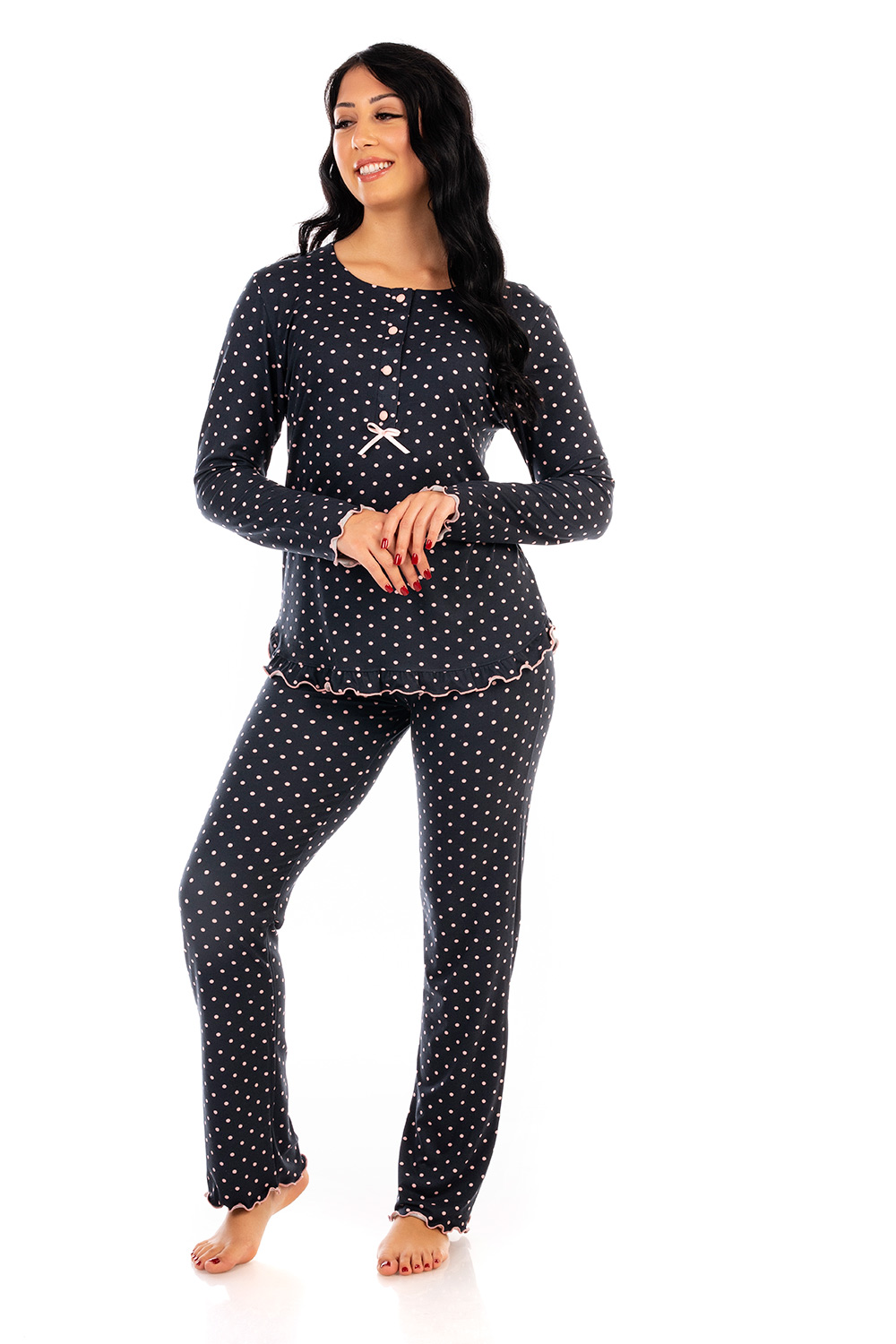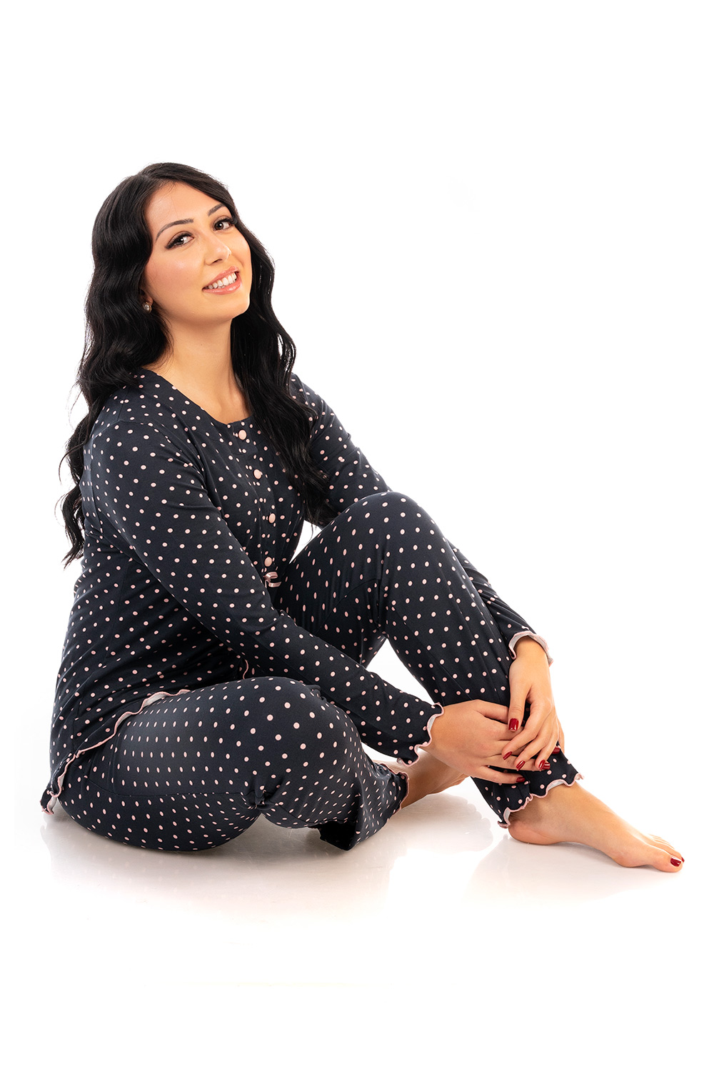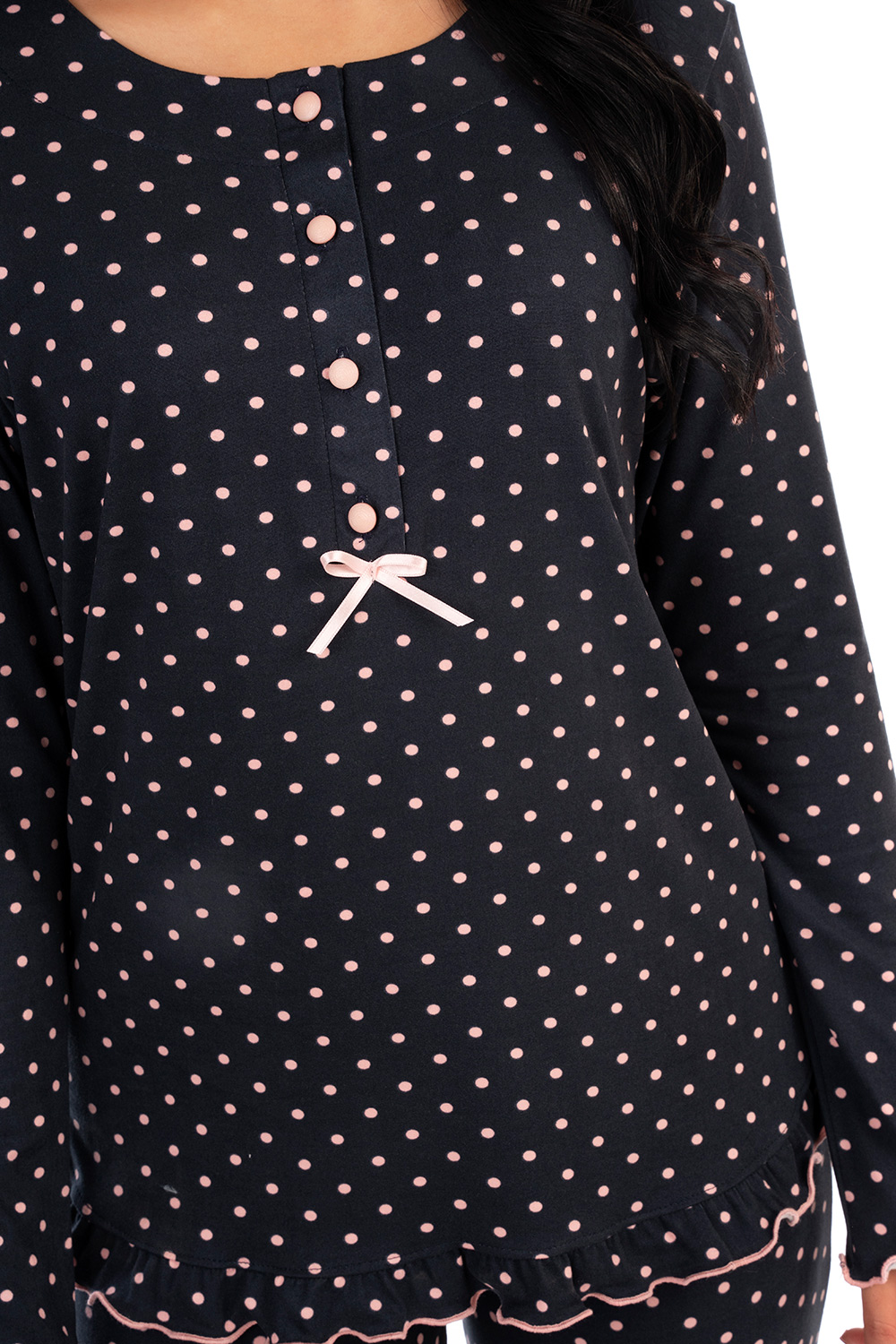 Επιλέξτε ένα Σετ γυναικείες πιτζάμες που προσφέρει διαχρονική κομψότητα κατασκευασμένη από απαλή βισκόζη που αγκαλιάζει ευχάριστα το σώμα ενώ επιτρέπει στο δέρμα να αναπνέει. Το επάνω μέρος είναι σχεδιασμένο με πατιλέτα, στρογγυλή λαιμόκοψη, μακριά μανίκια ενώ το τελείωμα της μπλούζας είναι με βολάν. Το Σετ συμπληρώνει το παντελόνι σε άνετη γραμμή σχεδιασμένο σε ροζ πουά μοτιβό σε μπλε φόντο ολοκληρώνοντας το σύνολο με αρμονία. Ένα ιδανικό Σετ για να απολαύσετε ένα όμορφο απόγευμα ή τον βραδινό σας ύπνο. Ελληνικό προϊόν.