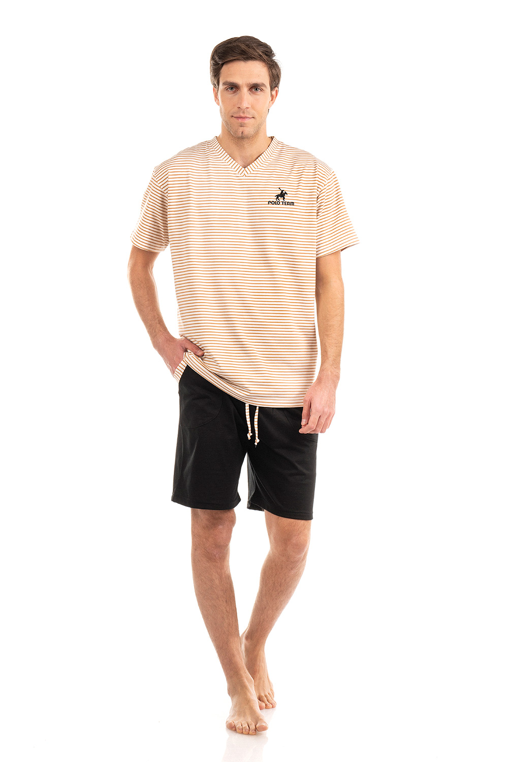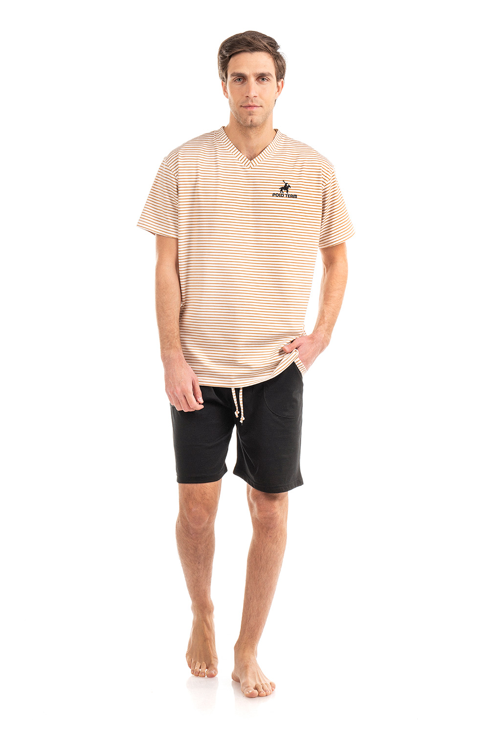 Ανανεώστε την γκαρνταρόμπα σας με αυτό το ανδρικό Σετ πιτζάμες, φτιαγμένο από βαμβάκι για μοναδική άνεση. Το χαλαρό μπλουζάκι σε ριγέ μοτίβο, με V λαιμόκοψη, κοντά μανίκια και κέντημα στο στήθος ενώ το κοντό μονόχρωμο παντελόνι με τσέπες στο πλάι προσφέρει ισορροπια και κομψότητα στο σύνολο. Ιδανικό για στιγμές χαλάρωσης ή τον βραδινο σας ύπνο.