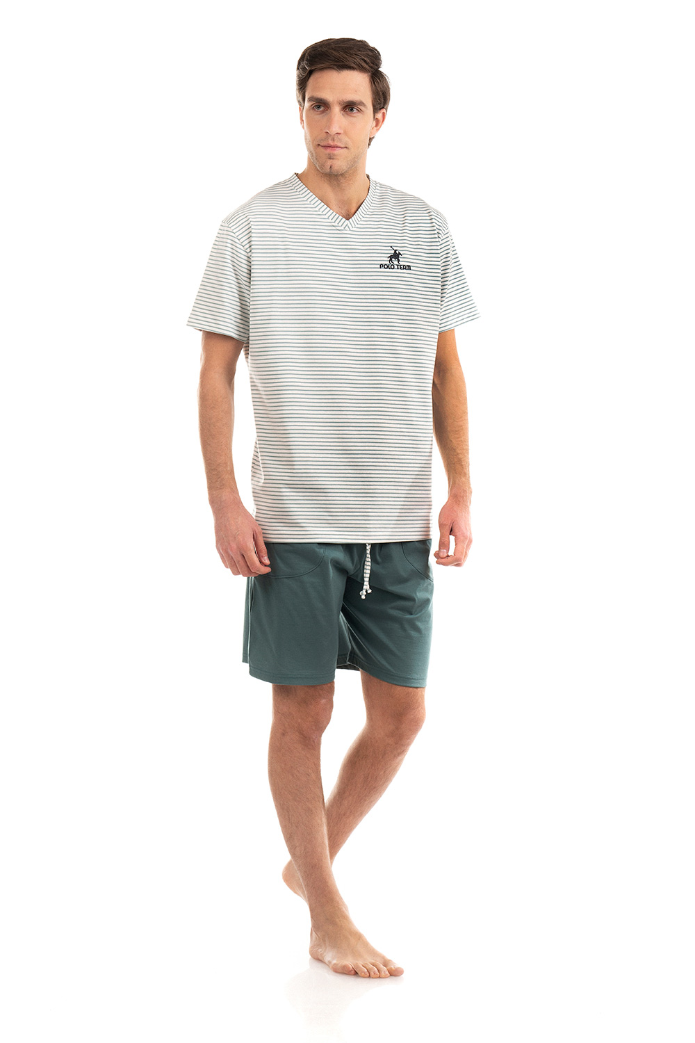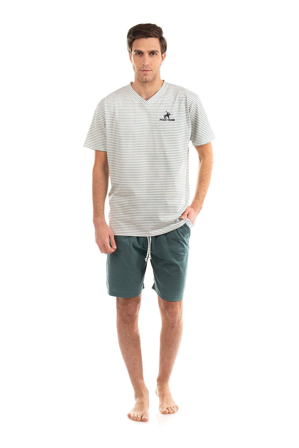 Ανανεώστε την γκαρνταρόμπα σας με αυτό το ανδρικό Σετ πιτζάμες, φτιαγμένο από βαμβάκι για μοναδική άνεση. Το χαλαρό μπλουζάκι σε ριγέ μοτίβο, με V λαιμόκοψη, κοντά μανίκια και κέντημα στο στήθος ενώ το κοντό μονόχρωμο παντελόνι με τσέπες στο πλάι προσφέρει ισορροπια και κομψότητα στο σύνολο. Ιδανικό για στιγμές χαλάρωσης ή τον βραδινο σας ύπνο.