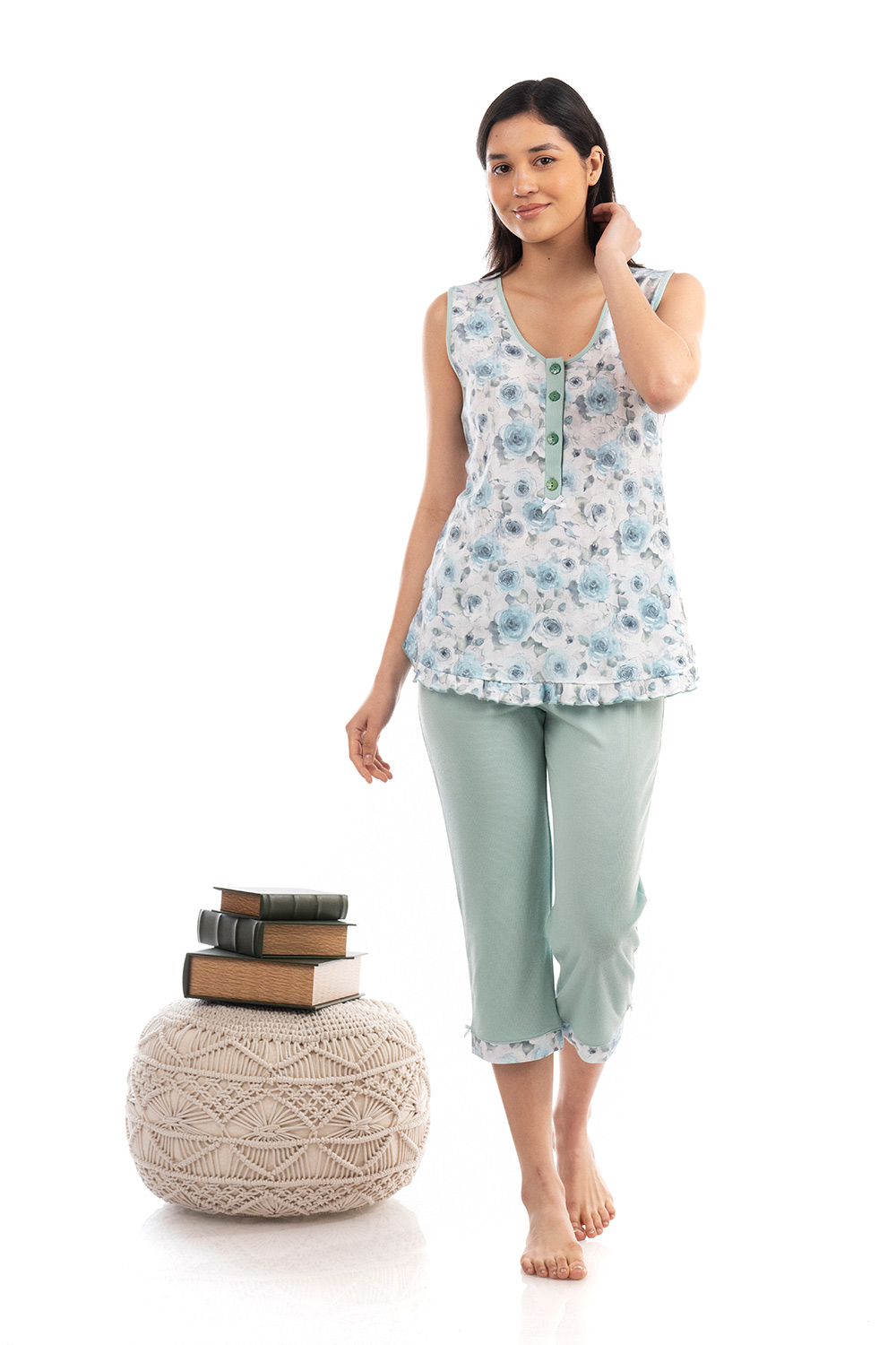 Επιλέξτε ένα ανάλαφρο Σετ Καλοκαιρινές Γυναικείες πιτζάμες με μονόχρωμο κάπρι παντελόνι και αμάνικο τοπ σε εμπριμέ ρομαντικό μοτίβο. Σχεδιασμένο με πρακτική πατιλέτα στο στήθος, V λαιμόκοψη και βολάν στο κάτω μέρος. Κατασκευασμένο από απαλό ριπ θα σας βοηθήσει να απολαύσετε με άνεση κάθε σας στιγμή στο σπίτι.