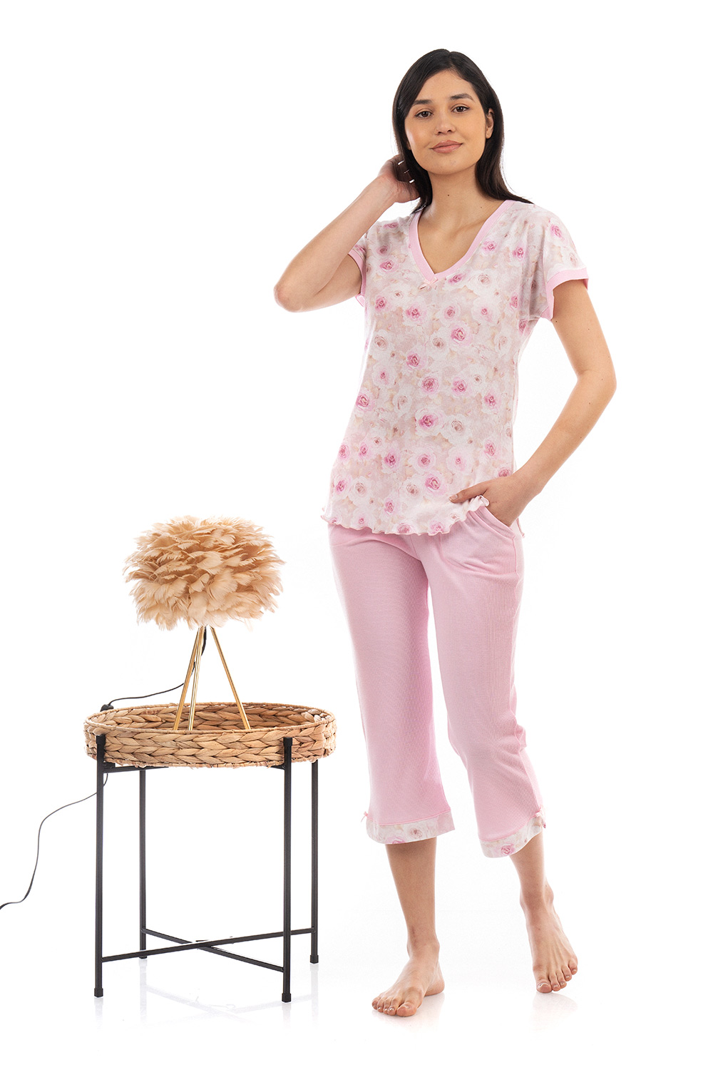 Βυθιστείτε στην άνεση με ένα Σετ Καλοκαιρινές Γυναικείες Πιτζάμες σε ροζ αποχρώσεις. Αποτελείται από μονόχρωμο κάπρι παντελόνι με εμπριμέ τελείωμα στο κάτω μέρος και τσέπες στο πλάι. Συνοδεύεται από εμπριμέ μπλούζα με κοντό μανίκι, V λαιμόκοψη και ροζ λεπτομέρειες. Σχεδιασμένο σε κανονική γραμμή και κατασκευασμένο απο απαλό Ριπ που επιτρέπει στο σώμα να αναπνέει, προσφέρει ανάλαφρη αίσθηση που θυμίζει χαλάρωση και καλοκαιρινές διακοπές.