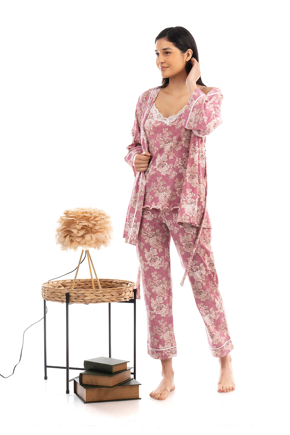 Απολαύστε στιγμές ηρεμίας και χαλάρωσης με ένα Σετ Καλοκαιρινές πιτζάμες που αποτελείται από εμπριμέ κάπρι παντελόνι, τοπ με λεπτές ρυθμιζόμενες τιράντες, V λαιμόκοψη με μαλακή δαντέλα και σταυρωτή ρόμπα με μανίκι, ζώνη στη μέση και σατέν λεπτομέρειες που χαρίζουν μια νότα ρομαντισμού και θυληκότητας. Κατασκευασμένο απο 100% μαλακό βαμβάκι και σχεδιασμένο σε κανονική γραμμή για άνετη εφαρμογή θα σας βοηθήσει να απολαύσετε ένα όμορφο πρωινό στο σπίτι.