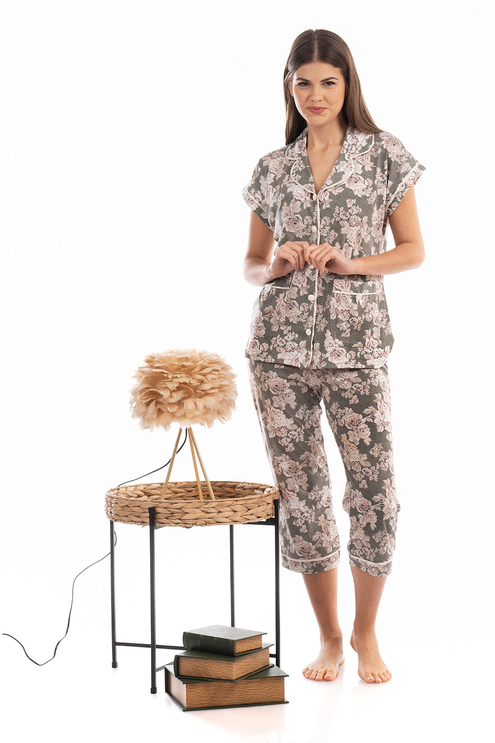 Προσθέστε στη συλλογή σας ένα Σετ Καλοκαιρινές Γυναικείες Πιτζάμες σε κομψό μοτίβο με τριαντάφυλλα σε Λαδί παστελ απόχρωση. Το Σετ αποτελείται από κάπρι παντελόνι και κουμπωτή μπλούζα με κοντό μανίκι, γιακά και σατέν λεπτομέρειες. Σχεδιασμένες σε κανονική γραμμή και κατασκευασμένες απο 100% βαμβάκι που επιτρέπει στο δέρμα να αναπνέει και χαρίζει μοναδική απαλότητα στο σώμα είναι ιδανικές για τις ζεστές καλοκαιρινές ημέρες.
