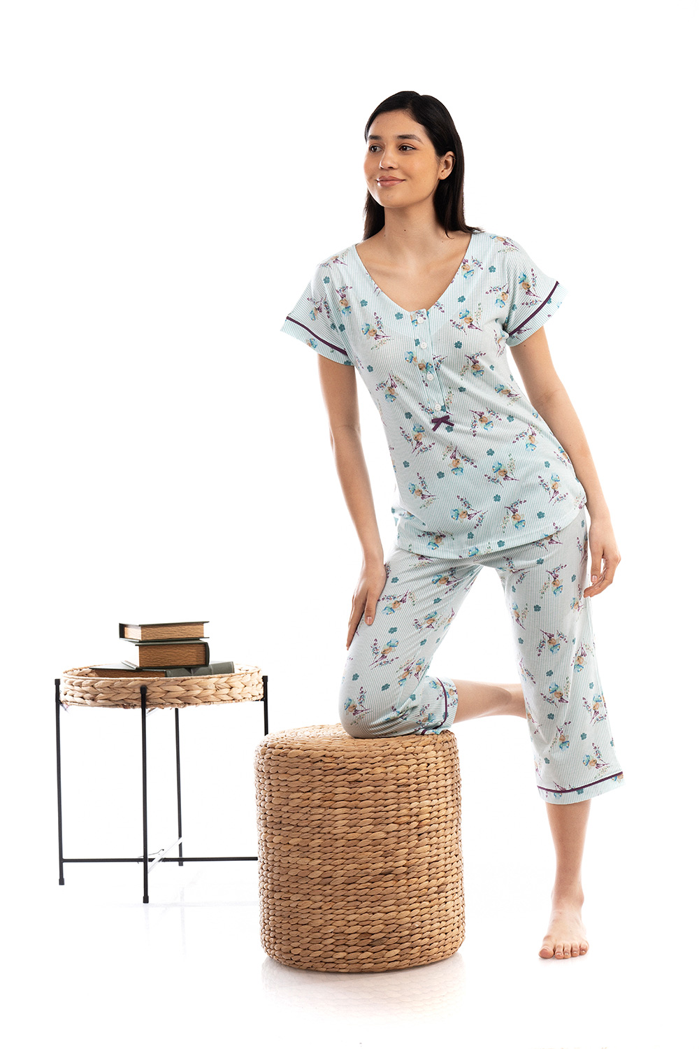 Παραμείνετε άνετη και δροσερή με ένα Σετ Καλοκαιρινές Γυναικείες πιτζάμες που αποτελείται από εμπριμέ κάπρι παντελόνι και μπλούζα με κοντό μανίκι, V λαιμόκοψη, πατιλέτα για καλύτερη άνεση και σατέν λεπτομέρειες. Σχεδιασμένο σε κανονική και άνετη γραμμή και κατασκευασμένο απο μαλακό βαμβάκι θα σας βοηθήσει να απολαύσετε το βραδινό σας ύπνο.