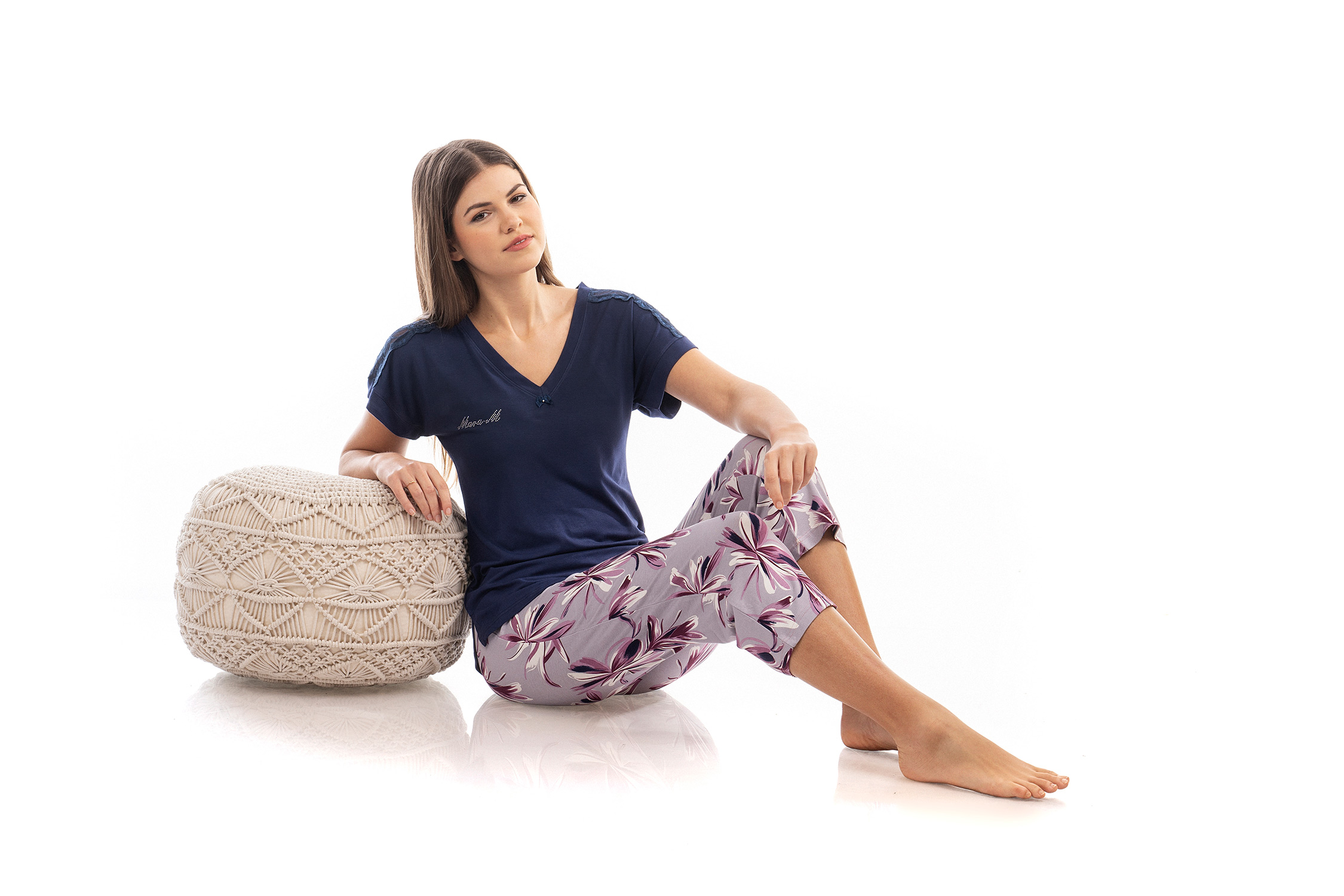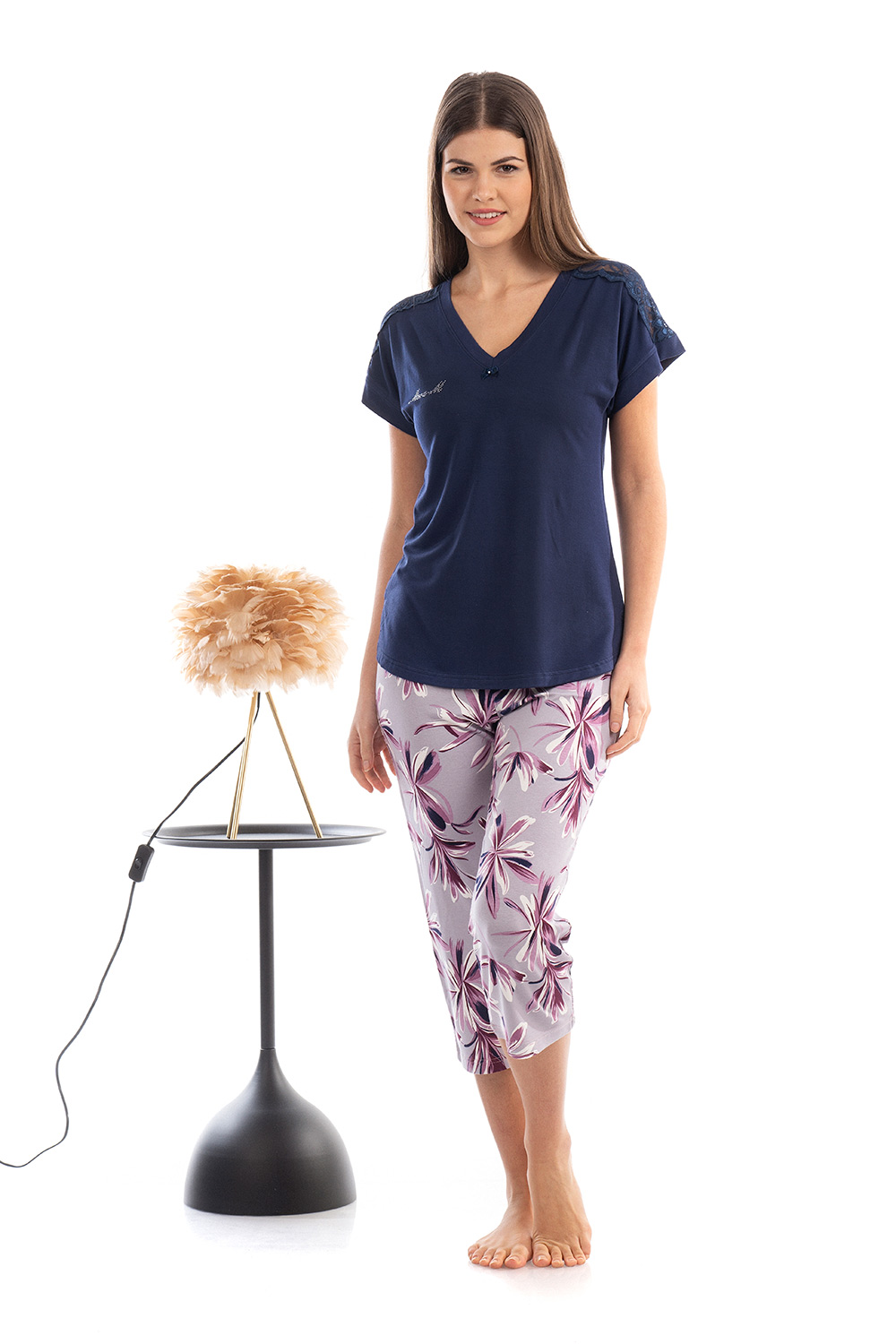 Δώστε άνεση στα απογεύματα σας με ένα Σετ Καλοκαιρινές Γυναικείες πιτζάμες που αποτελείται από κάπρι παντελόνι σε μοτίβο με φύλλα του ωκεανού και μονόχρωμη μπλούζα που δημιουργεί ένα αρμονικό σύνολο. Το τοπ είναι σχεδιασμένο σε χαλαρή γραμμή με κοντά μανίκια διακοσμημένα με δαντέλα και λαιμόκοψη V που προσδίδει μια θυληκή νότα στο Σετ. Κατασκευασμένες απο εξαιρετικά απαλό βισκόζ που επιτρέπει στο δέρμα να αναπνέει θα σας βοηθήσει να χαλαρώσετε μετά απο μια μεγάλη ημέρα.