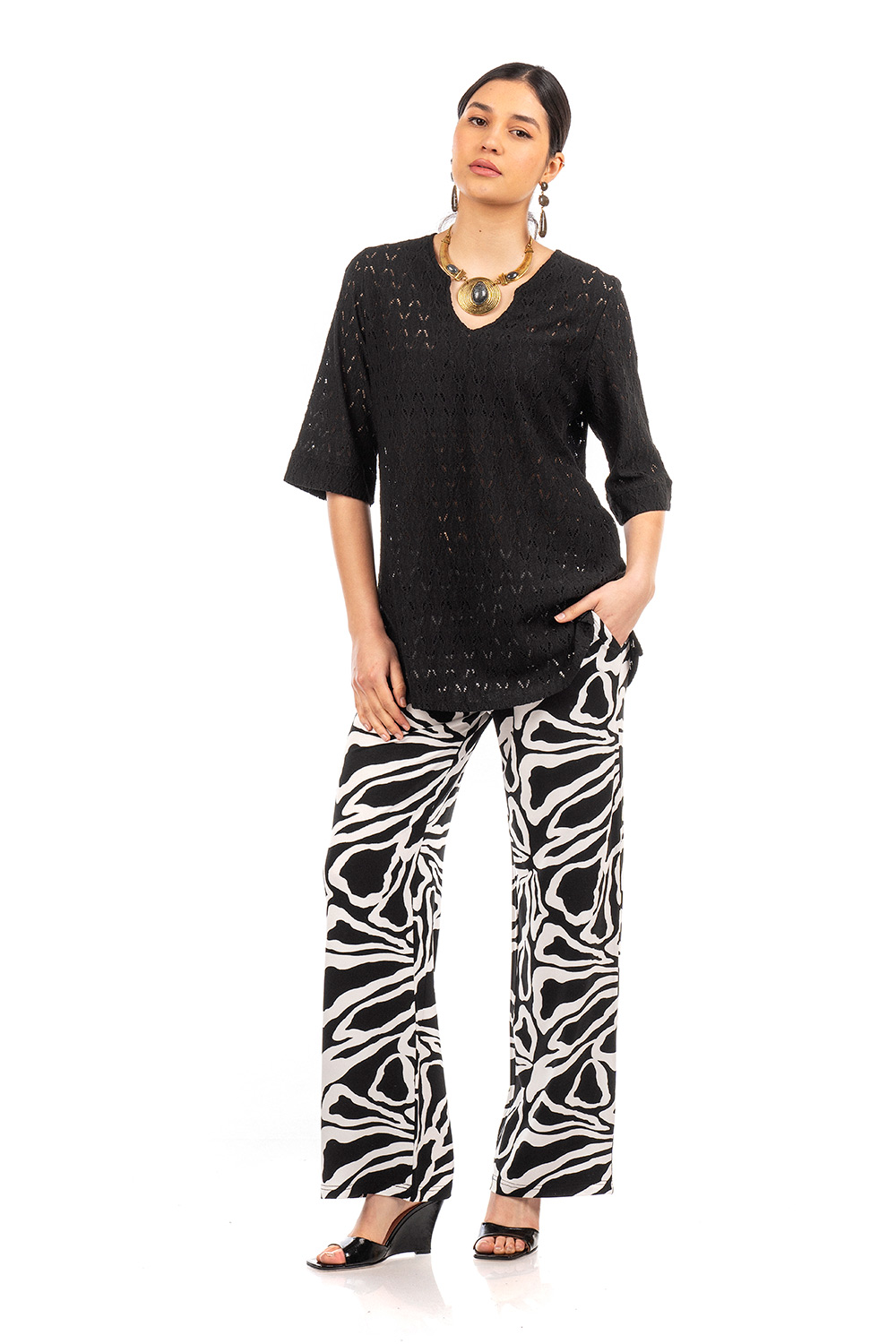 Απογειώστε την εμφάνιση σας με ένα καλοκαιρινό Σετ. Μπλούζα μονόχρωμη διάτρητη με στρογγυλή λαιμόκοψη, κοντά μανίκια και εμπριμέ παντελόνι σε άνετη γραμμή με τσέπες στο πλάι. Ιδανική επιλογή για εσάς που αγαπάτε την άνεση και το στυλ.